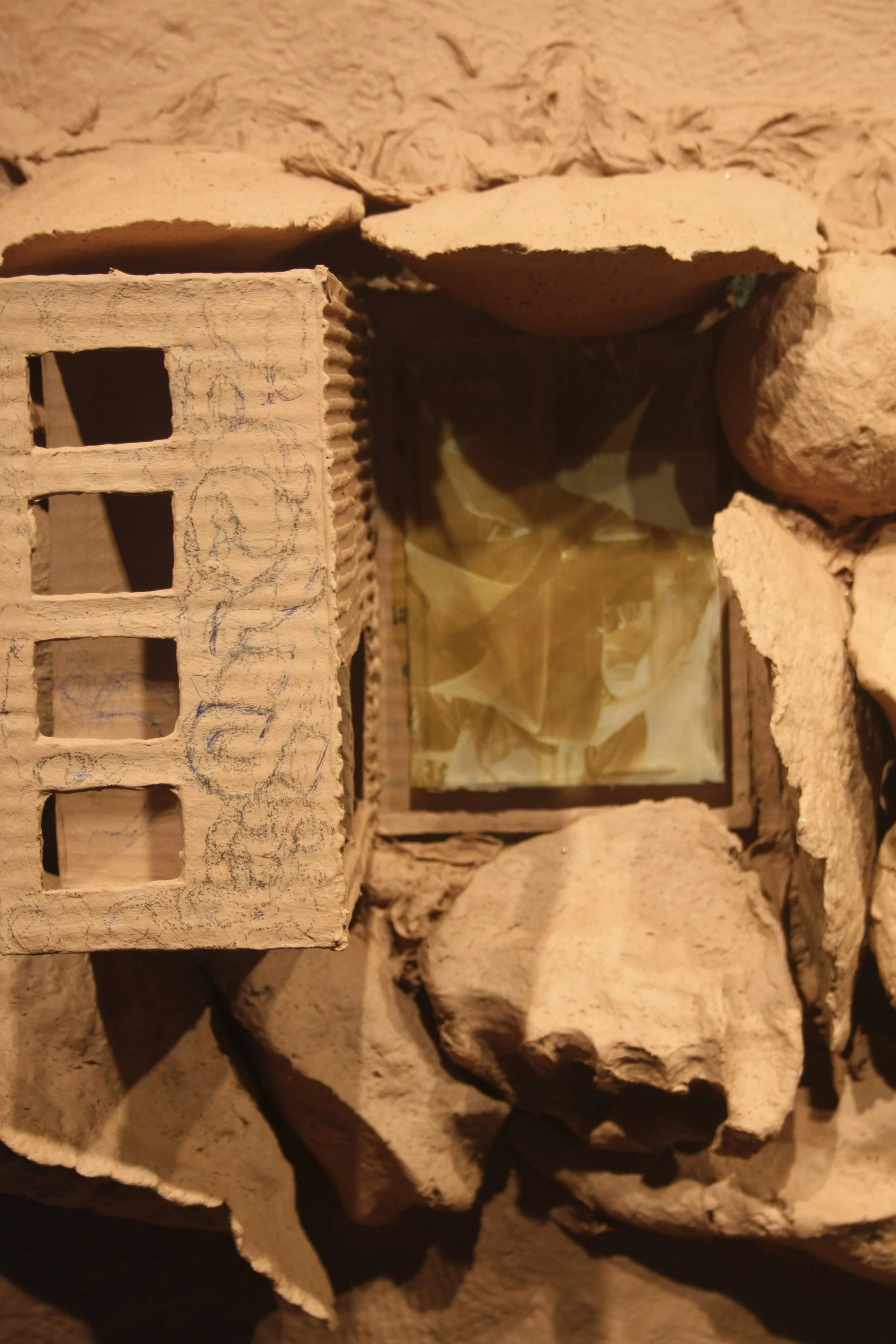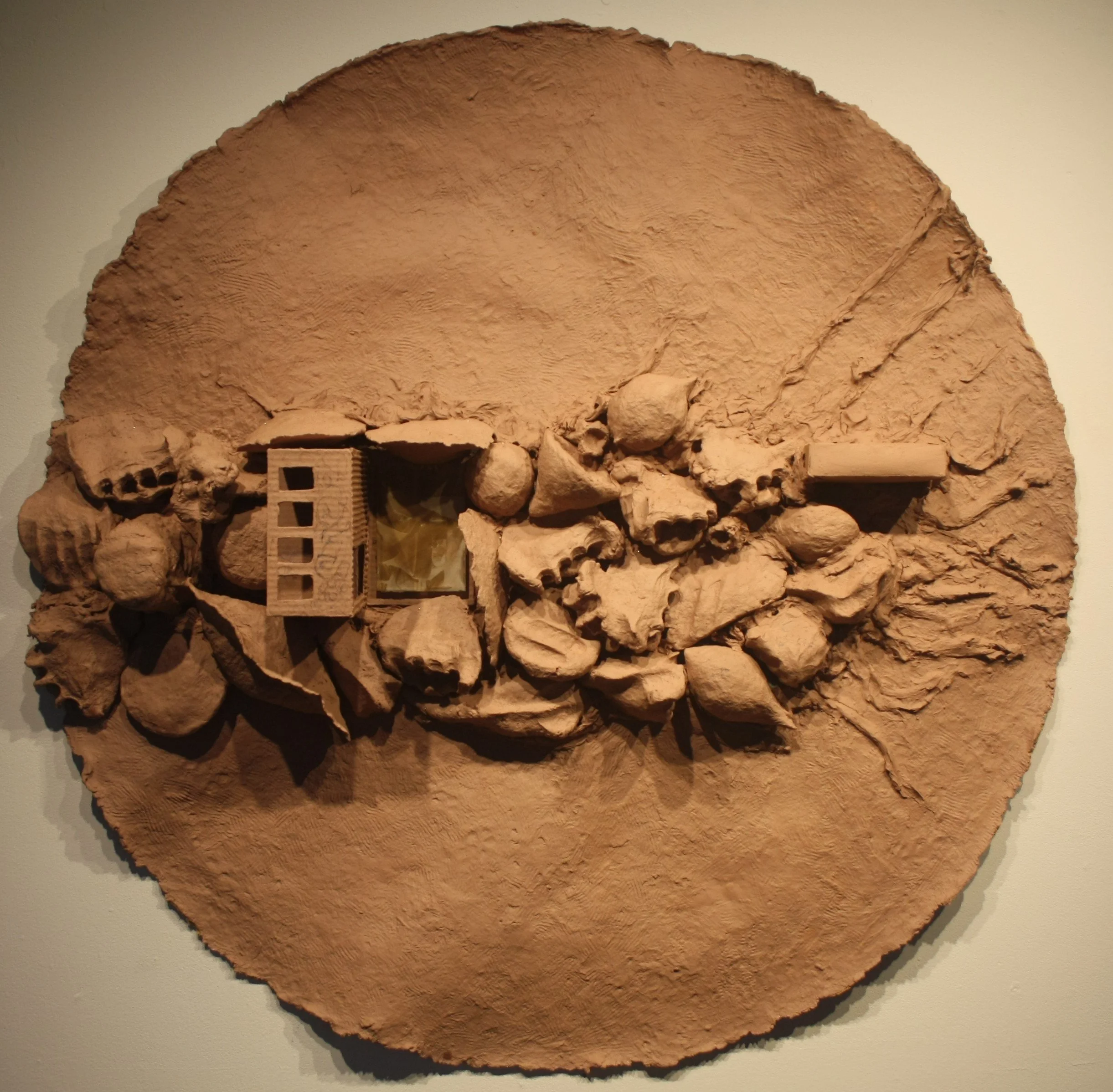 Reimagining bíōsis, Hand-made Paper Clay, cardboard, Terra-Cotta slip, thread, 39 x 39 inches, 2025