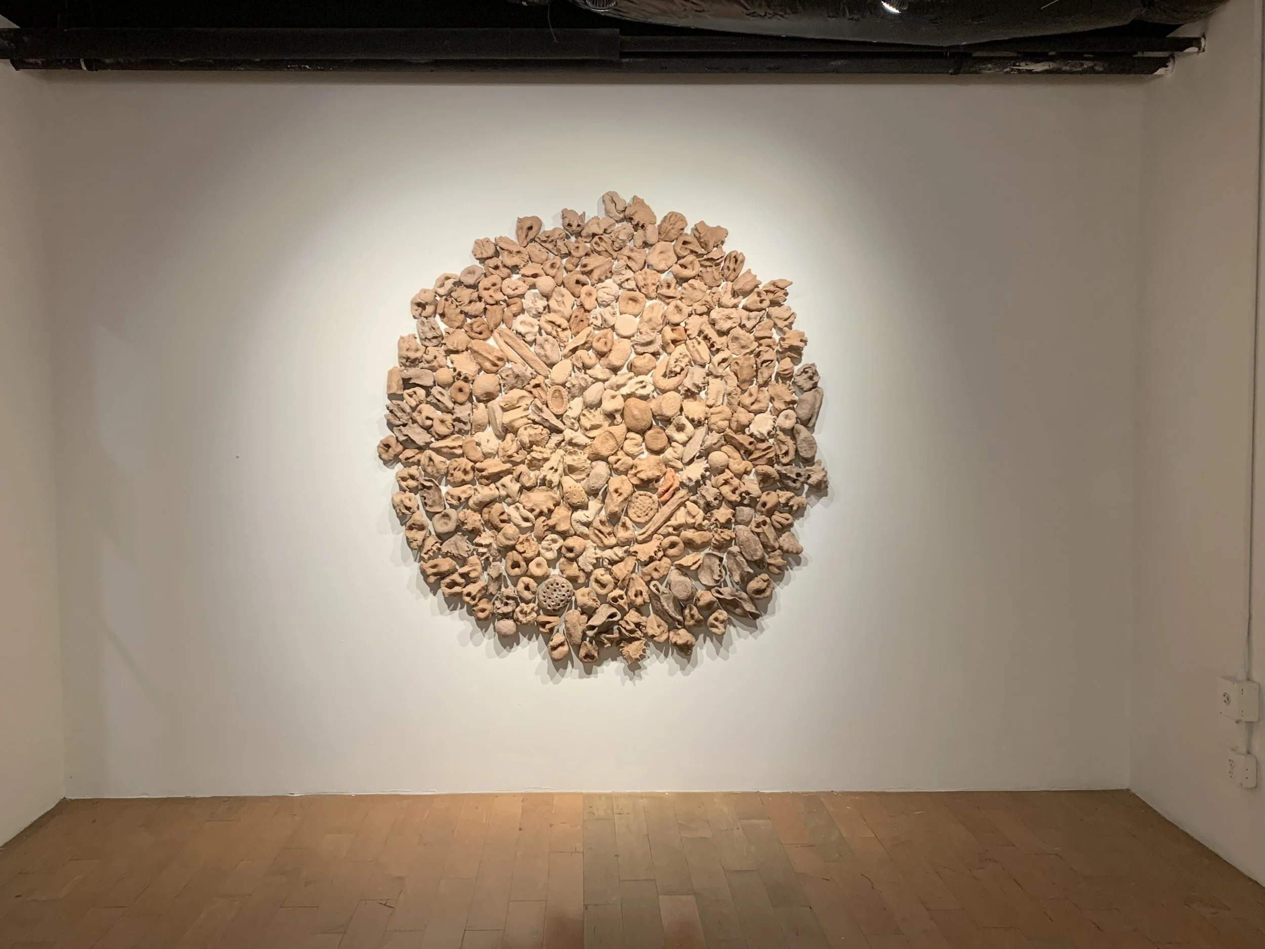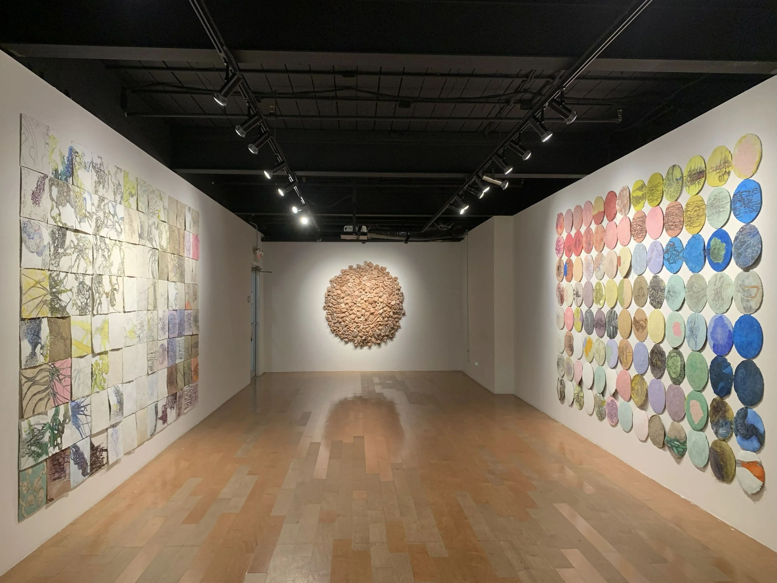 I began experimenting with paper clay sheets during the COVID-19 Pandemic while working with different materials, processes, and surfaces. I am interested in using materials that are easily accessible, reusable/recyclable, and inexpensive. After exploring different paper clay recipes, surface consistencies, and forms, I noticed that the recipes that worked best for me (which I ended up reusing) could be endlessly investigated. For instance, changing the amount of one ingredient alone will result in significant surface variations, such as different consistencies, colors, and water-absorbing qualities. Another obvious example of how one ingredient can modify the surface and its consistency is the type of paper used in the process (e.g., paper bags, cardboard, toilet paper, egg cartons, etc.), each with its unique physical properties that, when combined, produce interesting textures and visual experiences. Some sheets are more rigid and less water-absorbing, while others are softer in consistency and prone to soak in more media. I also noticed that individual sheets, while drying, would often shift from a flat plane into a curved plane, slightly activating the audience's space and their plane of vision. The curvature of each sheet depended on a variety of factors, such as the thickness of individual sheets, the type of paper used, and which drying technique was utilized (e.g., fans, blow dryers, sunbaked, or a combination of all three). I also came to understand how the type of mark-making that I was able to produce on a given surface was dependent on the consistency of its form. My interest in drawing biomorphic forms stems from my research into the world of microbiology, including the scientific work of evolutionary biologist Lynn Margulis, whose research on "symbiosis in evolution" was a turning point in our understanding of genomic evolution. I am fascinated by the symbiotic relationships between bacteria, fungi, plants, and animals. Holobiont Assemblage is an experimental drawing in progress, encompassing references to different life forms living as an ecological unit.